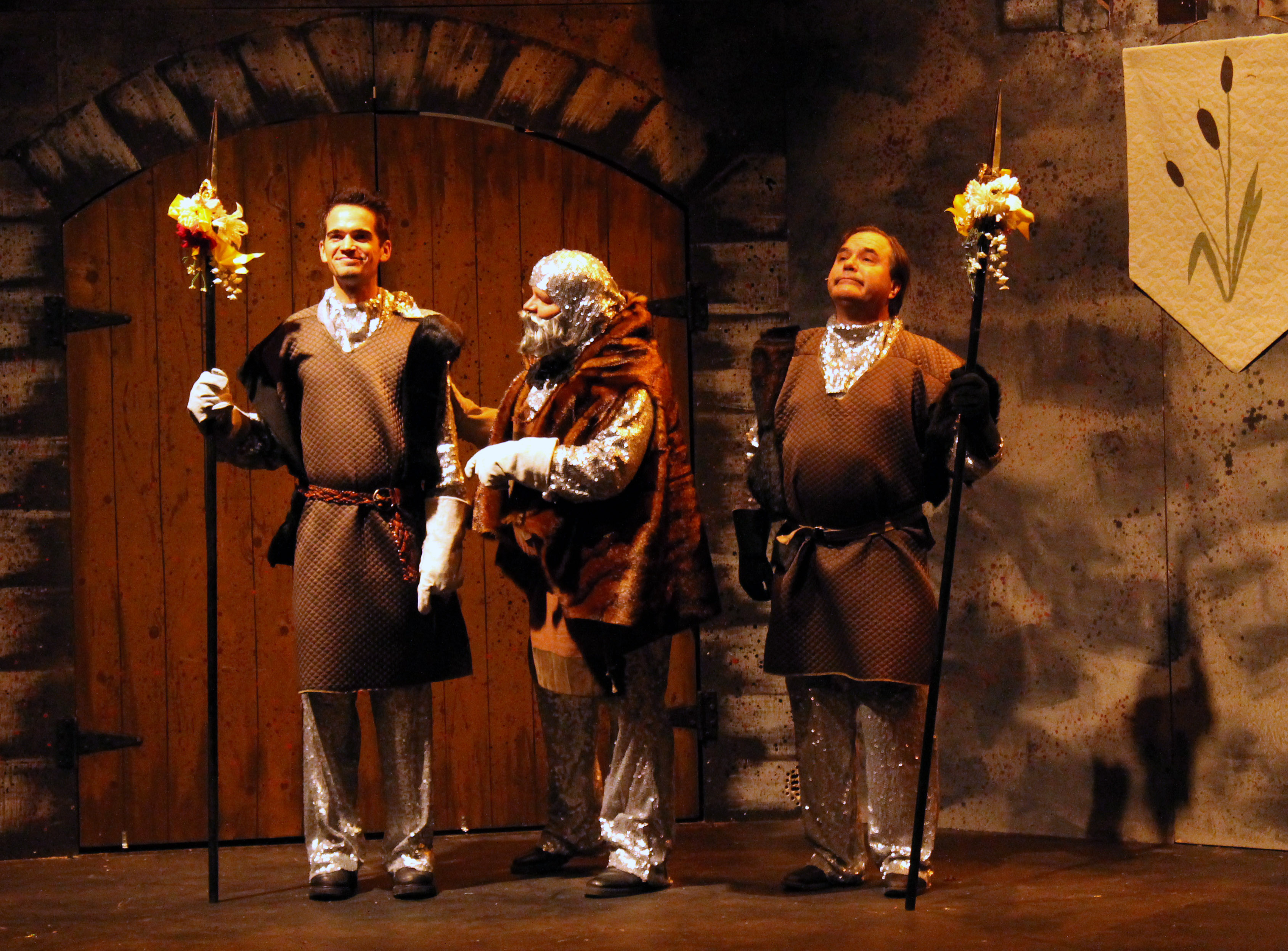 From the reaction I saw at Front Row Centre’s production of the show, the audience heartily agreed with the accolades. They laughed enthusiastically at the jokes, even though it was apparent that most audience members knew the bits well from undoubtedly numerous viewings of the cult classic film. Yes, the Black Knight who loses his arms and legs, yet still wants to fight is included in this show. As are the Knights who say Ni, the “Bring out yer Dead” bit, the rabbit with a killer instinct and of course the ridiculous but strangely still funny coconut-clacking, horseless riders. But with some hit and miss performances and at times clunky direction, I couldn’t help wondering if the laughs were actually resulting from the action on stage or if much of the delight was familiarity and memory-based.