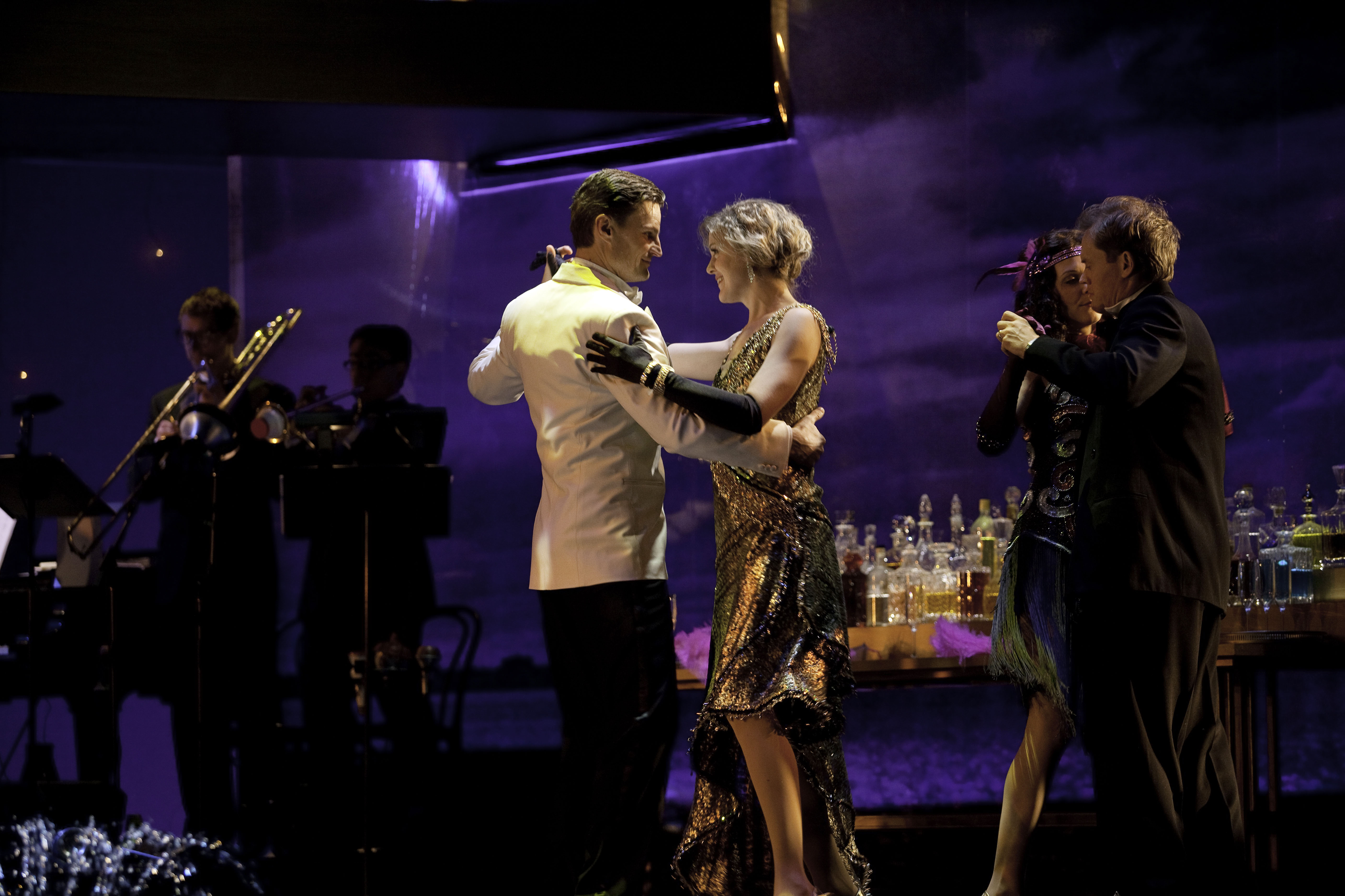 (l to r) BOB FRAZER (Jay Gatsby), AMY RUTHERFORD (Daisy Buchanan), CELINE STUBEL (Myrtle Wilson), CRAIG ERICKSON (Tom Buchanan). Photo by Trudie Lee.